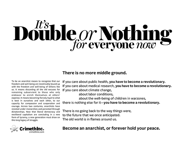 To be an anarchist means to recognize that our freedom and well-being are inextricably bound up with the freedom and well-being of billions like us. It means discarding all the old excuses for remaining subservient to those who only endeavor to enrich themselves at others’ expense. It means becoming fiercely loyal to what is best in ourselves and each other, to our capacity for compassion and cooperation and courage. Across two centuries, anarchists have resisted under monarchies and persisted through dictatorships. Now that liberal democracy and neoliberal capitalism are concluding in a new form of tyranny, a new generation must draw on this long legacy of struggle.