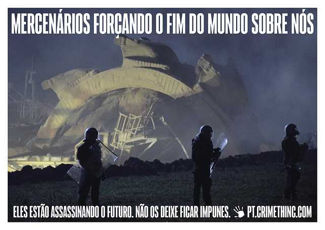 À medida que a mudança climática se aproxima do ponto sem retorno, lembre-se que depois de 11 de setembro de 2001, o FBI declarou que os ativistas ambientais eram o inimigo número 1 dos Estados Unidos. À medida que as temperaturas sobem, lembre-se de como os políticos aprovaram leis para proteger os que lucram com combustíveis fósseis. Enquanto os furacões atingem a costa, lembre-se de como policiais jogam spray de pimenta nos olhos de manifestantes. Enquanto as enchentes destroem cidades, lembre-se de todas as pessoas que a polícia atacou em Standing Rock. Enquanto as florestas se transformam em fumaça, lembre-se de como a tropa de choque atacou a multidão para que eles pudessem expandir a mina a céu aberto em #Lutzerath. À medida que as calotas polares derretem, lembre-se de como os promotores acusaram os jovens de terrorismo por tentar proteger o meio ambiente do qual todos dependemos. Lembre-se de quem são os responsáveis. Se não fosse pela violência desses agentes, poderíamos já estar lidando com aqueles que estão impulsionando a mudança climática há muito tempo. Em troca de alguns trocados, eles estão nos empurrando para o fim do mundo. Eles estão assassinando o futuro. Não os deixe ficar impunes.